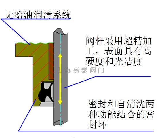 為了使密封系統(tǒng)能在低壓、抗腐蝕的狀況下有很高的效率,我們預(yù)先在填料下面加了一個彈簧,這樣就能根據(jù)彈簧的伸縮長度計算出預(yù)載力。當給填料施加的壓力越來越大時PTFE-V型填料的兩側(cè)就緊緊地貼在上閥蓋的內(nèi)側(cè)及閥桿上。為了能保證在不斷變化的工作條件下密封良好,V型填料用各種不同的PTFE化合物構(gòu)成。放在V型圈最上面的基礎(chǔ)圈起到防塵的作用。精密封元件是一種壓模成型圈,它由特殊的彈性材料構(gòu)成。從填料函最上端(即防塵圈)到精密封元件的距離與閥桿的行程相等。如此以來,這種結(jié)構(gòu)就防止了附著在閥桿外露表面的雜質(zhì)隨閥桿進入填料函內(nèi)部并對閥桿及密封元件造成破壞。當閥關(guān)閉時(閥桿不動時),既雜質(zhì)可能已通過防塵圈但決不會到達精密封元件上。