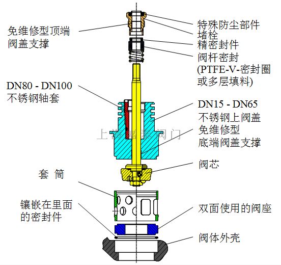 閥座的自對中任務(wù)是由固定件(套筒)來完成的,上閥蓋把作用在閥體上的部分壓力通過套筒傳遞到閥座上,使閥座和閥體配合得更為緊密。我們用專用數(shù)控加工中心加工和配置閥座和閥芯,這樣,套筒與閥座之間的縫隙就特別小,從而閥座受力就非常均勻,所以很容易達到自校正。這樣,在任何情況下都能保證密封件所需的壓力。由于有兩個間隔較大的專有導(dǎo)向套的作用,所以閥桿就會得到較好的導(dǎo)向功能。