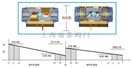上圖的示意圖表明,彈簧復位式執(zhí)行機構的扭矩不是恒定不變的而逐漸降低的。主要原因在于彈簧在空氣行程階段因